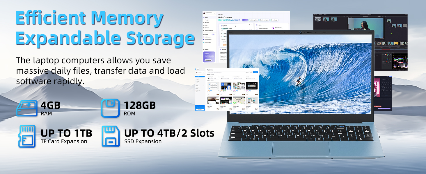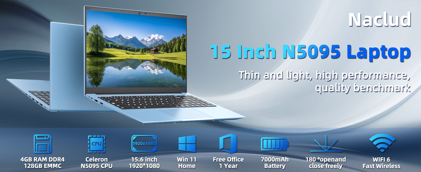 Naclud 15.6 Inch Laptops, Windows 11 Laptop Computer with 4GB RAM 128GB SSD, Expandable 4TB, Celeron N5095 Quad-Core(Up to 2.9GHz), 1 Year Office 365, WiFi 6, 7000mAh Battery, USB 3.2, HDMI, Type-C